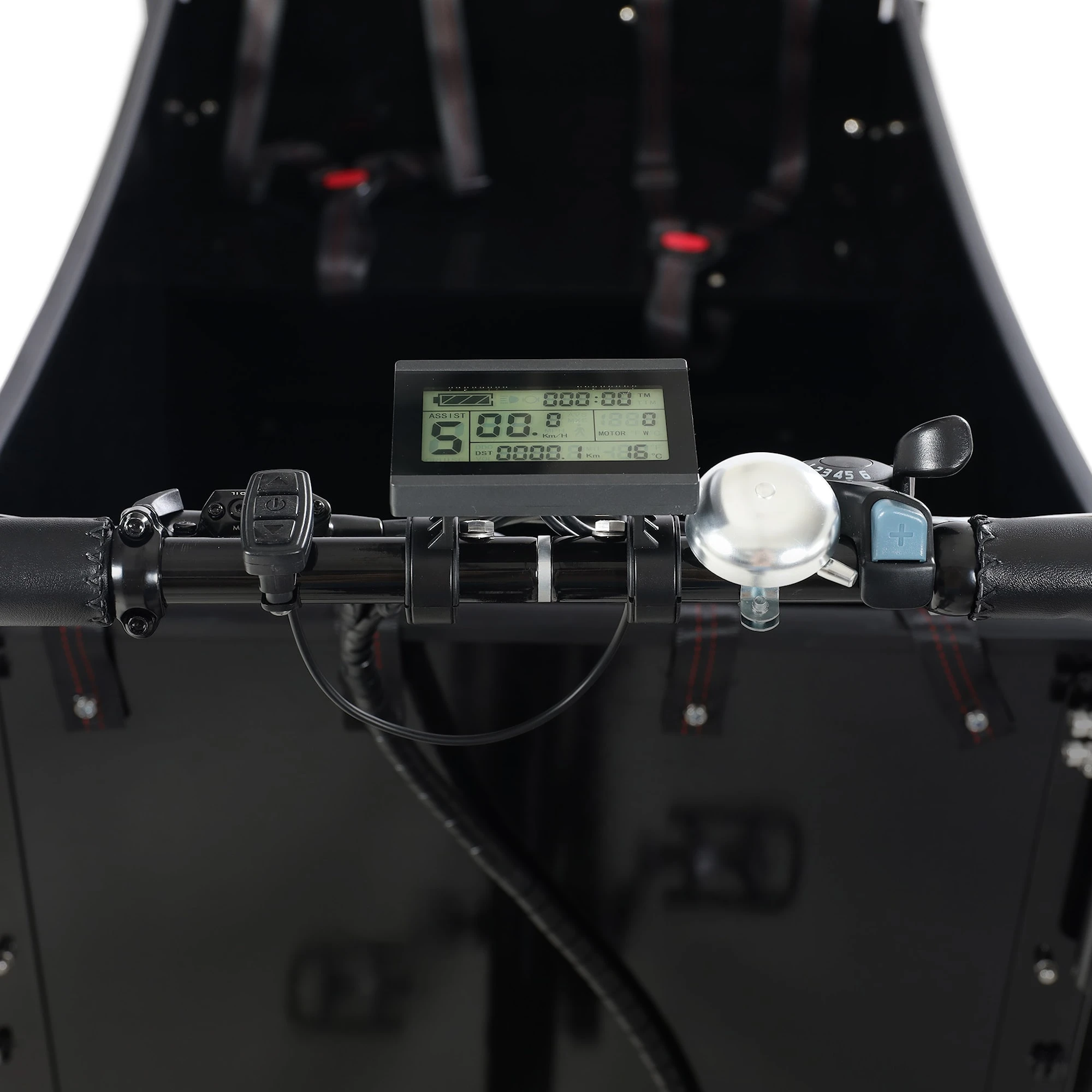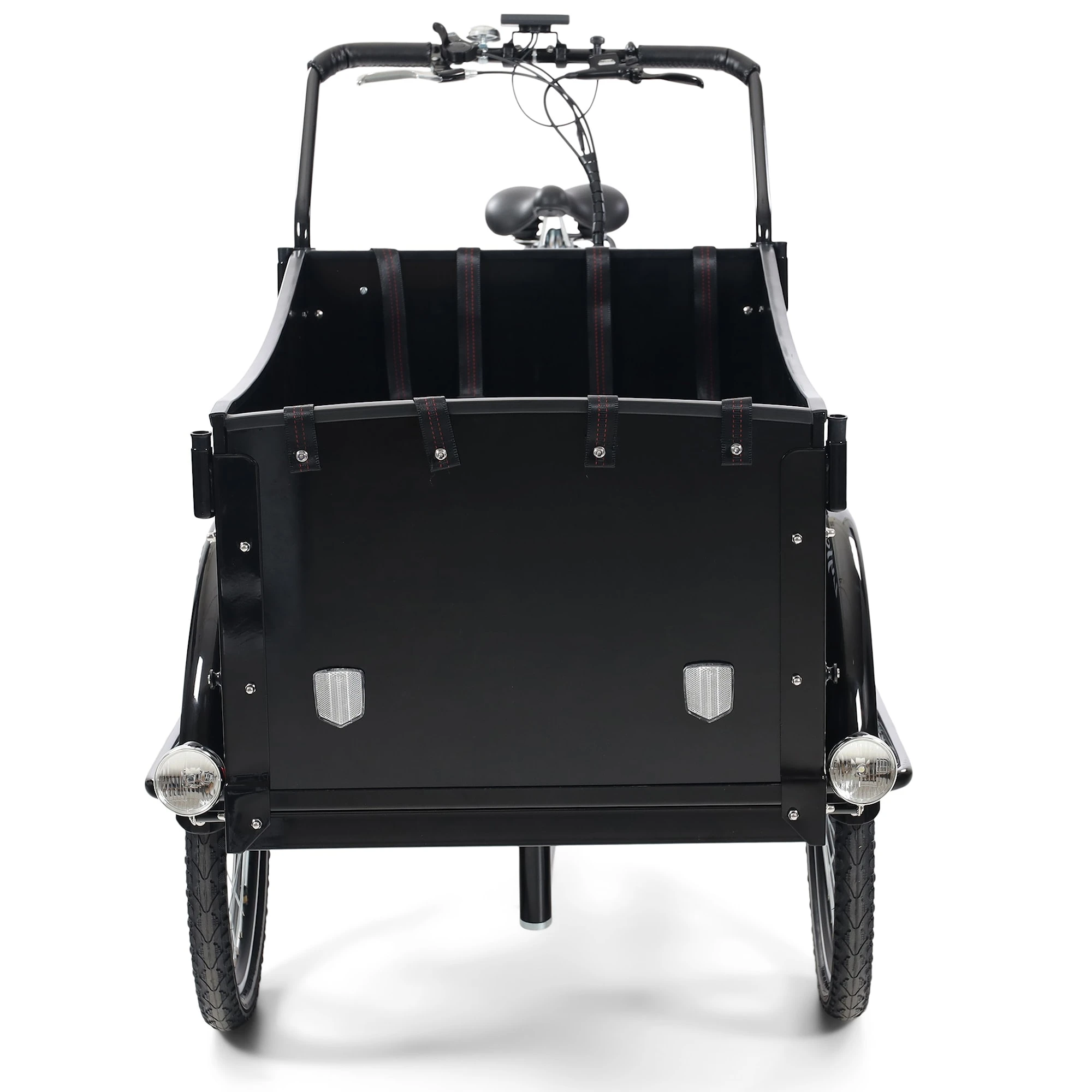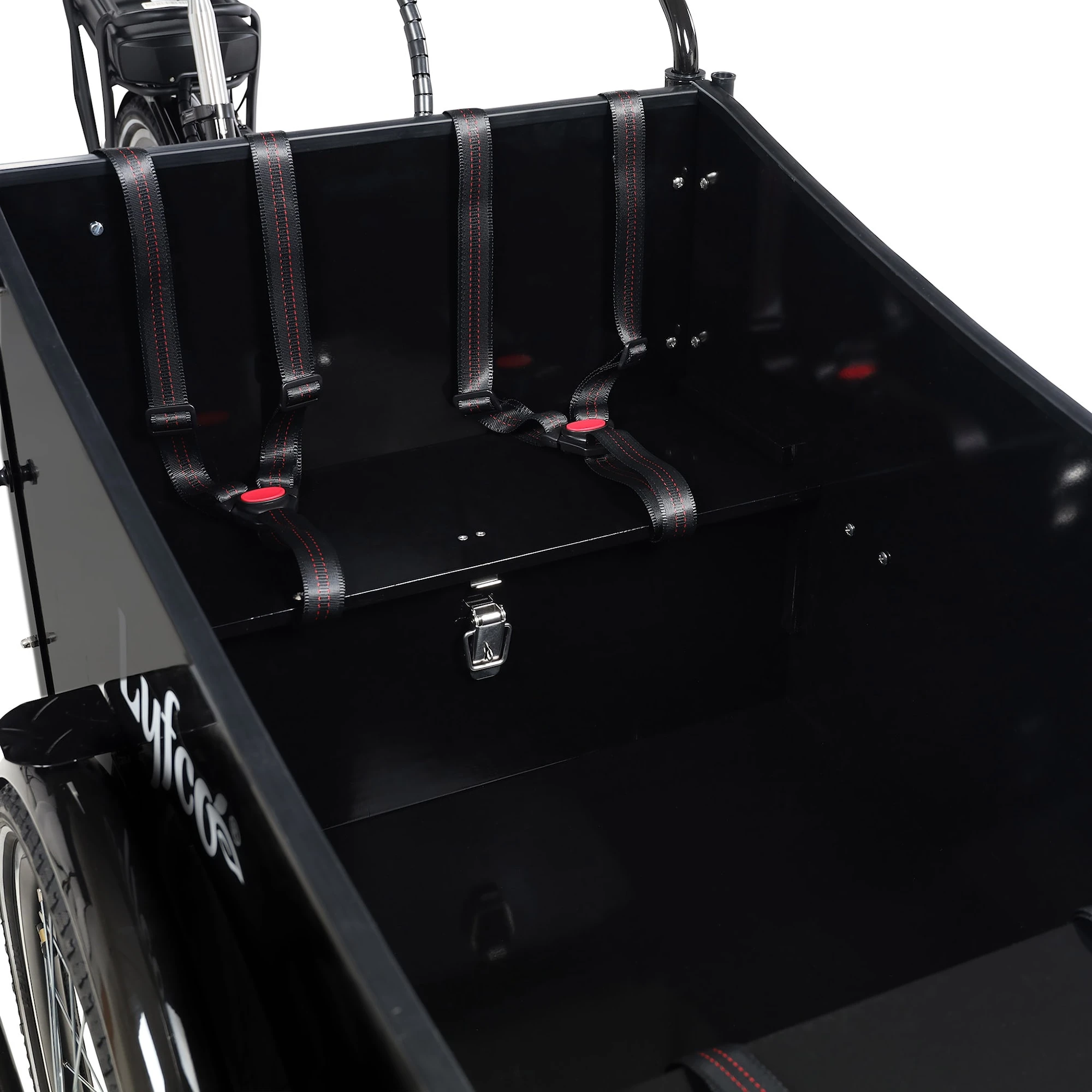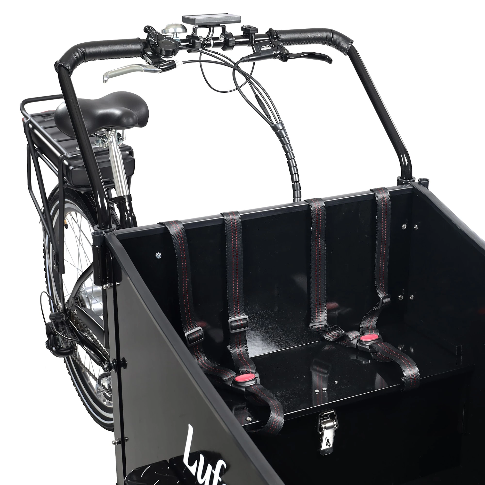 En eldriven lådcykel där du transporterar barnen smidigt och bekvämt samtidigt som packutrymmet i den svarta trälådan rymmer allt du behöver till cykelutflykten. Fyra 3-punktsbälten medföljer och gör så att passagerarna sitter säkert under färden. Måtten på packlådan är 101 x 62 x 55 cm.