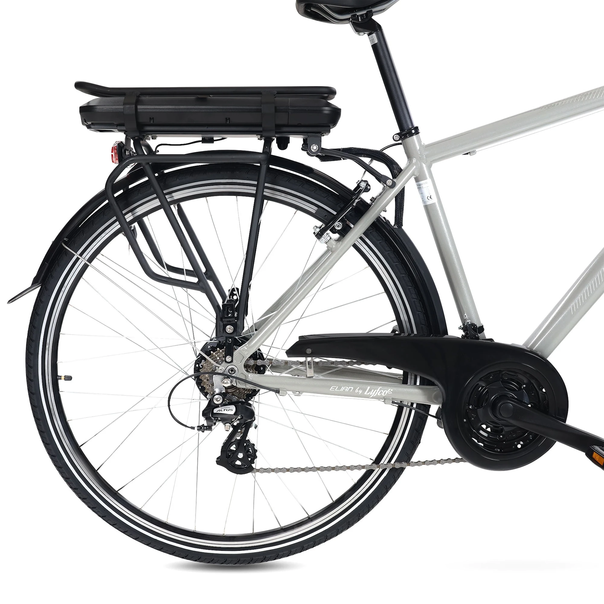 Låsbart, avtagbart batteri och batteriladdare medföljer. Batteriet är ett kraftigt 36 V/10.4 Ah litiumbatteri av märket Greenway. Växelsystemet med hela 21 växlar kommer från välkända Shimano. I denna modell används den lite bättre Shimano Altus-serien. Motorn är av en modern borstlös typ och mycket tystgående.