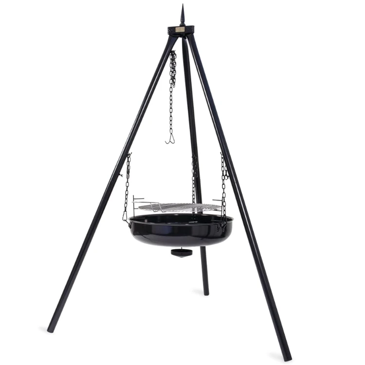 Braspannan har en robust trefotskonstruktion och är tillverkad i emaljerat stål där benen går att reglera efter underlaget så att den alltid står stadigt. Eldkaret kan justeras i höjdled – perfekt om du vill att pannan ska komma högre upp för att underlätta tillagning och närmare marken när du bara vill sitta och mysa. Braspannan har en diameter på 60 cm och levereras med grillgaller av rostfritt stål, kedja för kaffepanna. På braspannans undersida finns ett praktiskt uppsamlingskärl för fett, glöd och aska. Hålet i botten göra att lufttillförseln blir större vilket gör brasan enklare att tända.