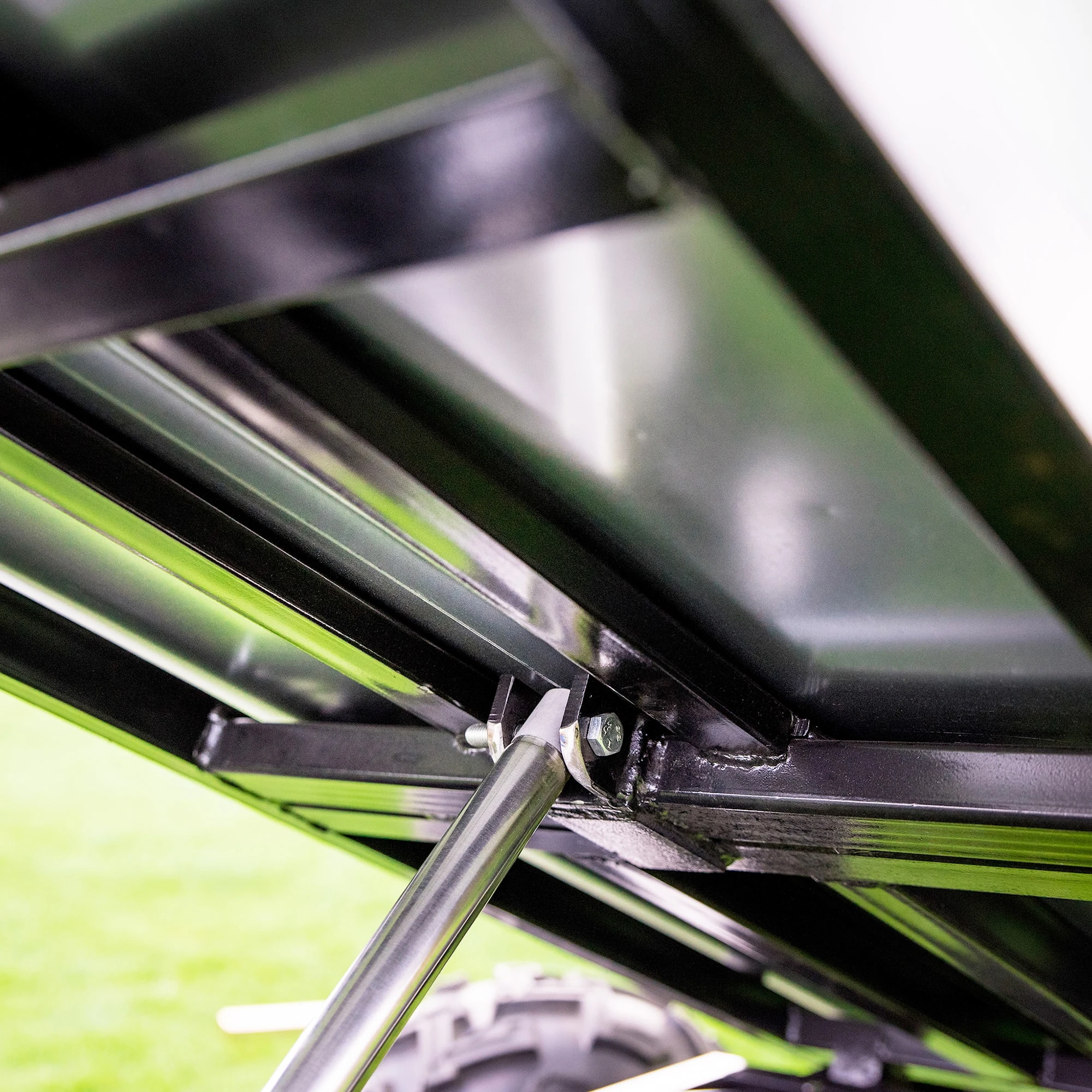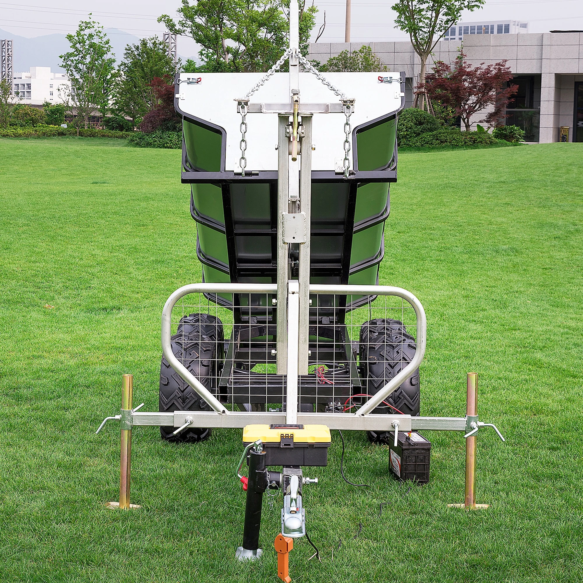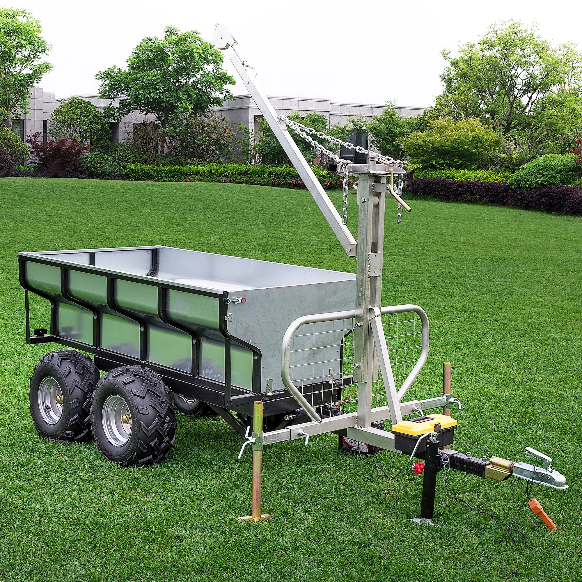 Mångsidig och praktisk timmervagn för ATV med en lastkapacitet på 1420 kg, inklusive kran. Släpets tippfunktion styrs helt med hjälp av elektronik vilket gör att du enkelt kan tippa flaket med endast elmotorn utan att behöva använda någon som helst muskelkraft. Tippningen navigerar du via en fjärrkontroll och den elektroniska motorn drivs av 12 V batteri eller genom att vagnen ansluts till en ATV. Observera att batteri ej ingår.