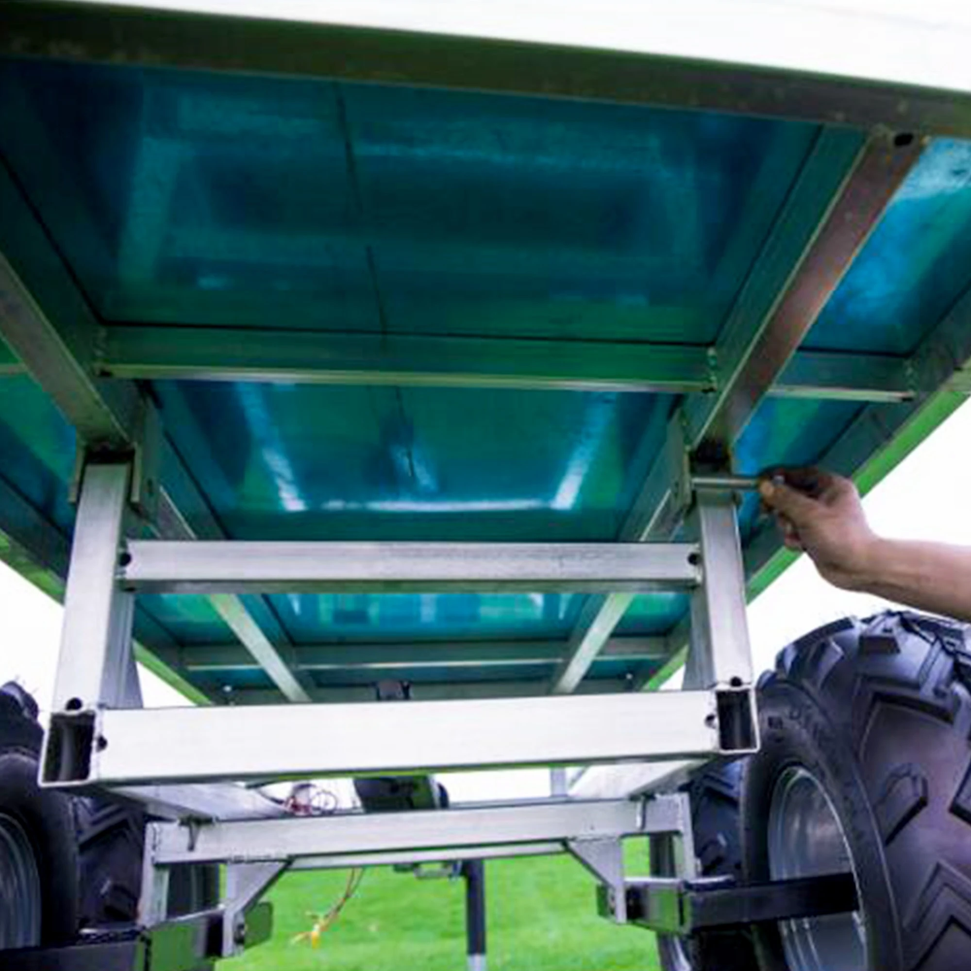 Vagnen har fyra stora robusta hjul (22 x 11-10) som gör att denna kraftiga dubbelboogie vagn har goda terrängegenskaper och därmed är lämplig för skogs- och lantbruk. Elektroniskt tippbart insatsflak i durkplåt med en maxlast på hela 1420 kg, vilket gör att den klarar de flesta av gårdens sysslor.