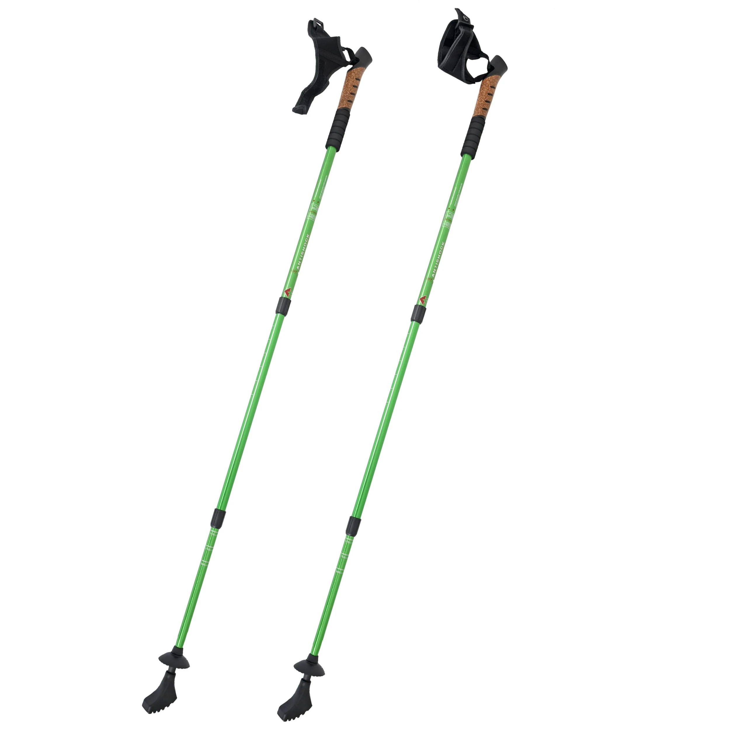 Med bred handledsrem och avtagbara gummifötter. Gummifötterna används på hårdare underlag såsom asfalt. Går du på mjukare underlag, till exempel på en skogsstig, tar du av fötterna och använder hårdmetallspetsarna.