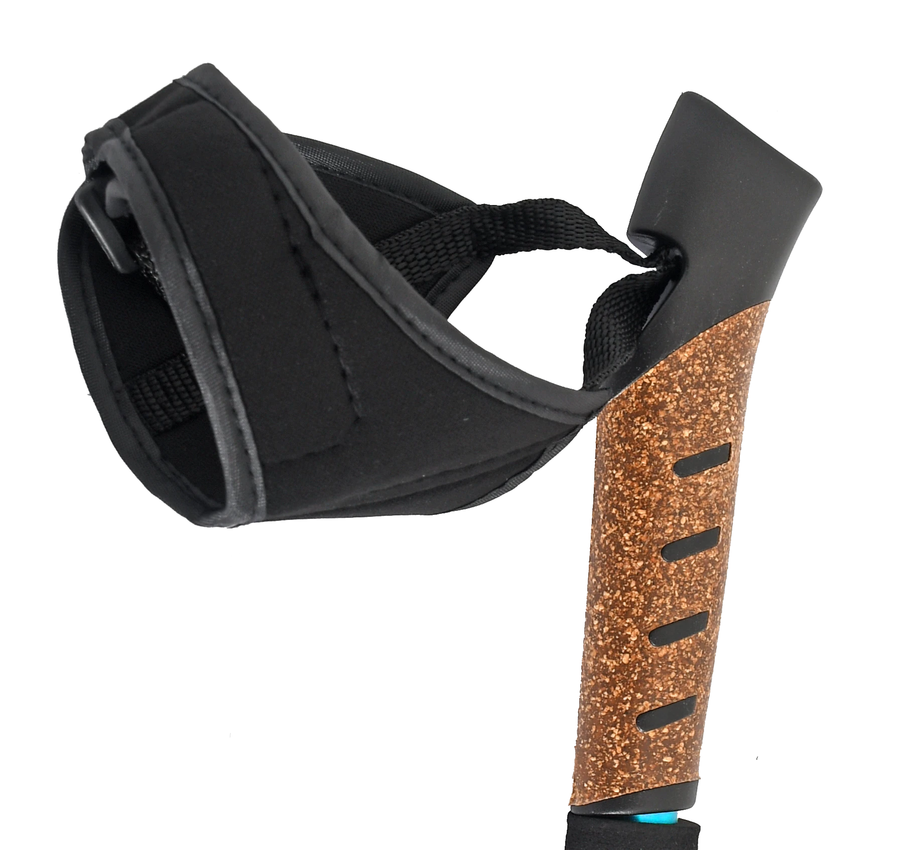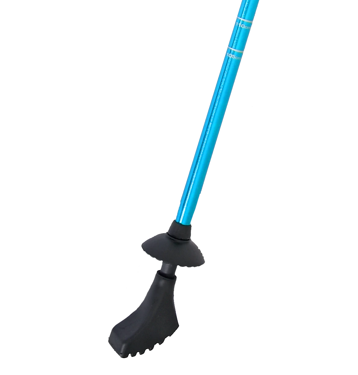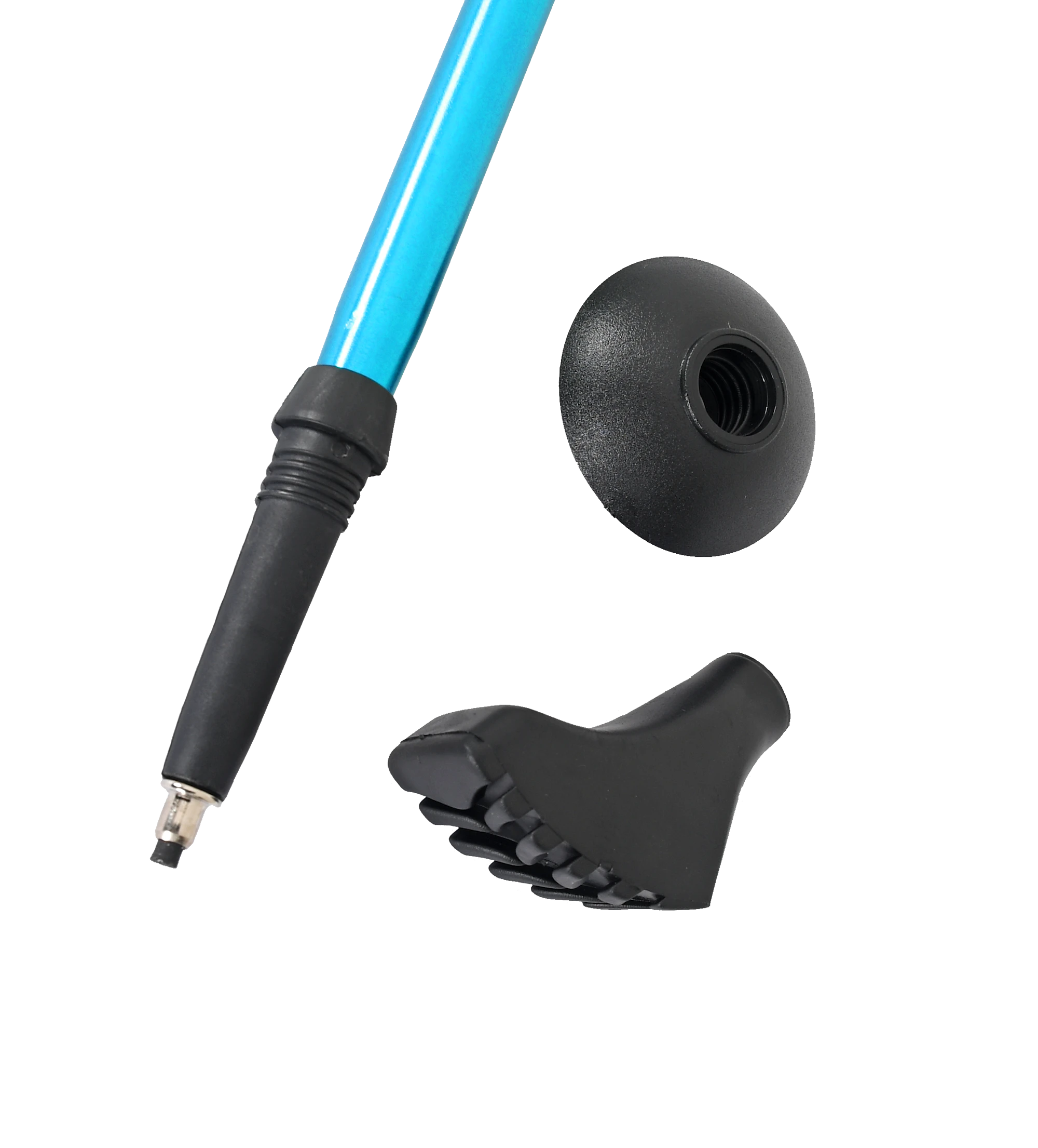 Med bred handledsrem och avtagbara gummifötter. Gummifötterna används på hårdare underlag såsom asfalt. Går du på mjukare underlag, till exempel på en skogsstig, tar du av fötterna och använder hårdmetallspetsarna.