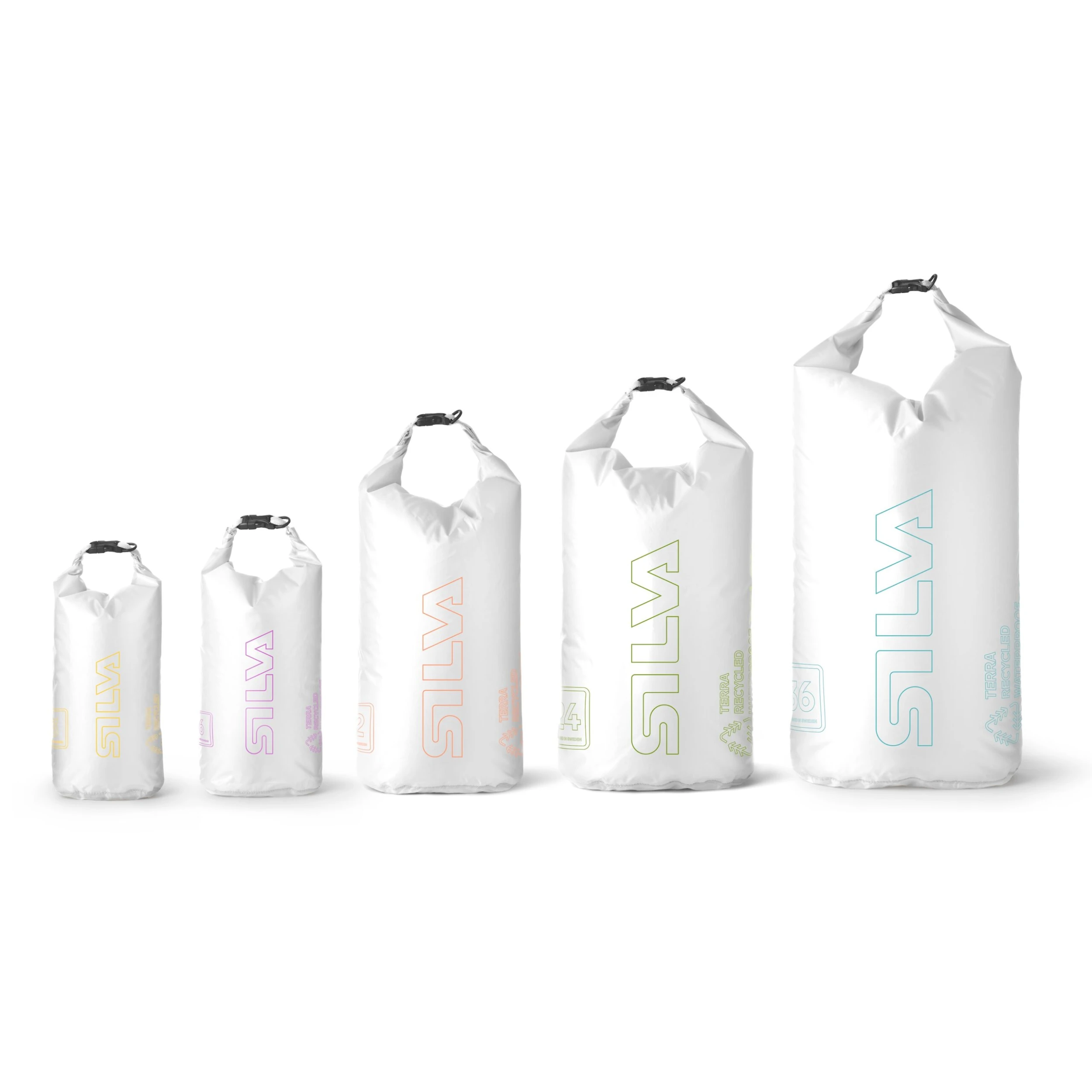 Terra Dry Bags är en uppdaterad version av Silva R-Pet serien som också var i återvunnet material men som var designade i olika färger och med fullfärgstryck. Med Terra-serien har det lagts ännu mer fokus på att minska miljöpåverkan och därför har alla infärgning och färgtryck reducerats till ett minimum. Resultatet är denna serie som har ofärgat polyestertyg med endast en utskuren logotyp som enda färgtryck.