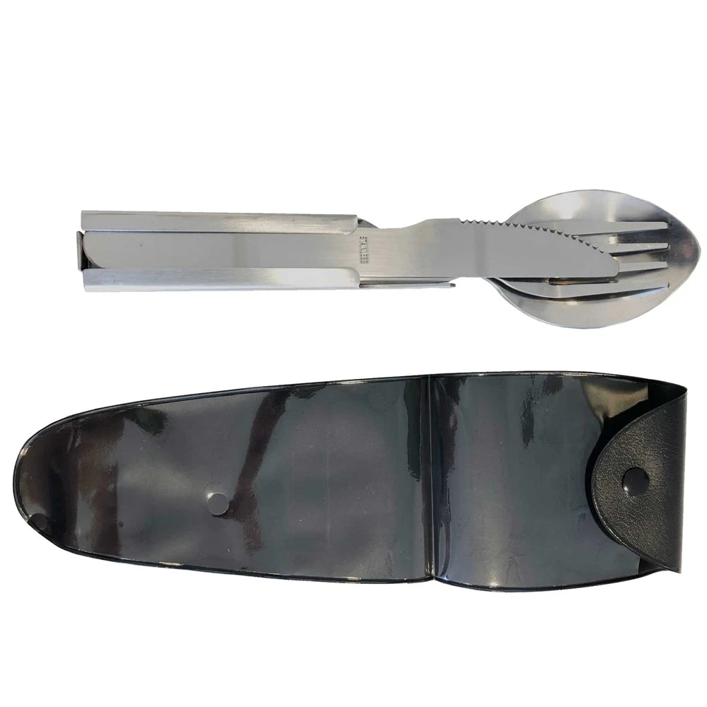 Bestickset helt i rostfritt stål som består av 4 delar: kniv, gaffel, sked och konservöppnare. Allt går att sammanfoga på ett smart sätt till en enhet.